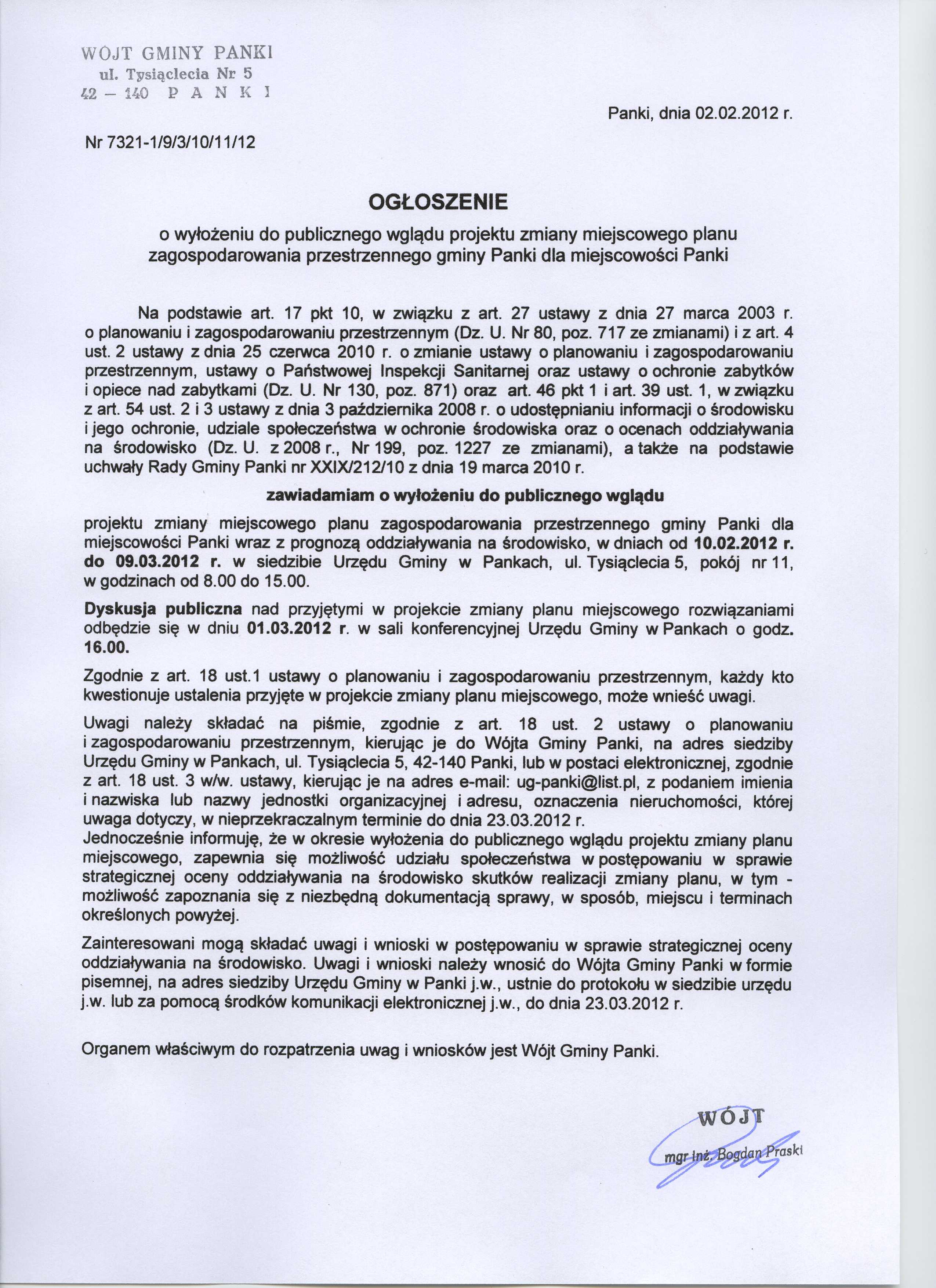 Na podstawie art. 17 pkt 1 i art 27 ustawy z dnia 27 marca 2003 r. o planowaniu i zagospodarowaniu przestrzennym (Dz. U. Nr 80, poz. 717 z późn. zm.) oraz art. 39 ust. 1 pkt 1 ustawy z dnia 3 października 2008 r. o udostępnieniu informacji o środowisku i jego ochronie, udziale społeczeństwa w ochronie środowiska oraz o ocenach oddziaływania na środowisko (Dz. U. Nr 199, poz. 1227 z póżn. zm.) zawiadamiam o podjęciu przez Radę Gminy Panki uchwał: